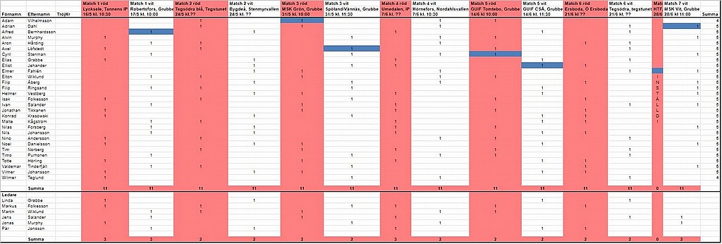 Nu börjar det bli dags för matcher. Vi har precis skickat ut kallelser för första helgen då 22 lyckliga spelare får göra debut. Kallelser kommer sedan eftersom, men ni kan i bilden se hur ursprungsplanen är. Alla spelare blir under vårsäsongen kallade till 5 eller 6 matcher (20200511, ändrat till 5 eller 4), då HTF dragit sig ur serien, så en match har blivit struken.